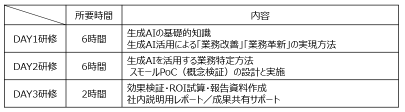 単なるAIツールの操作方法の習得にとどまらず、全社的な生成AI活用を視野に入れ、対象部門や業務の特定、基礎的なリテラシー習得を通じて、生成AIを使いこなせる人材を育成することを主眼としたプログラムです。
